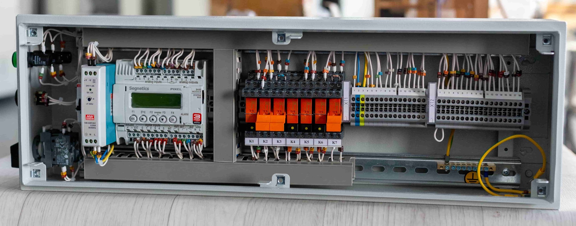 Система автоматики работает на контроллере Segnetics Pixel. Контроллер принимает сигналы с датчиков и выдает управляющие сигналы, соответствующие режиму и алгоритмам работы, на исполнительные устройства и реле для управления технологическим оборудованием. Шкаф имеет степень защиты IP65.