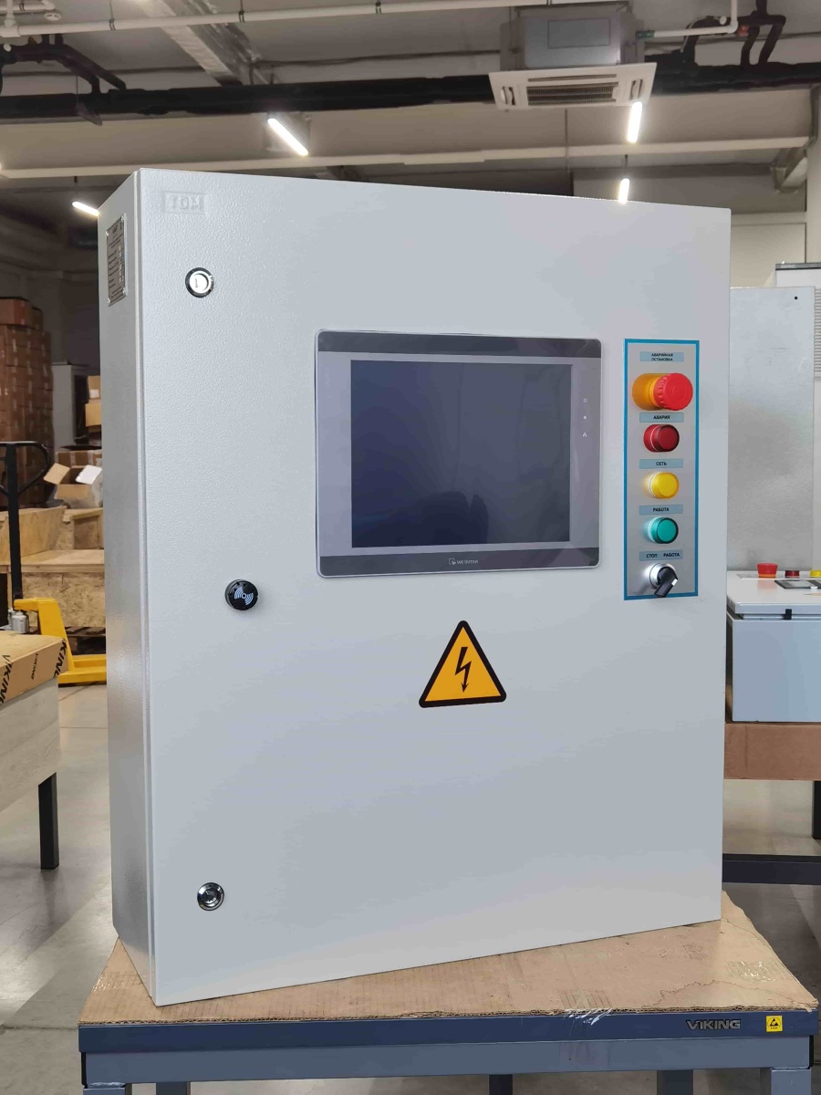 Система автоматики работает на контроллере Segnetics SMH4. Контроллер принимает сигналы с датчиков и выдает управляющие сигналы, соответствующие режиму и алгоритмам работы, на исполнительные устройства и реле для управления технологическим оборудованием. Шкаф имеет степень защиты IP54.